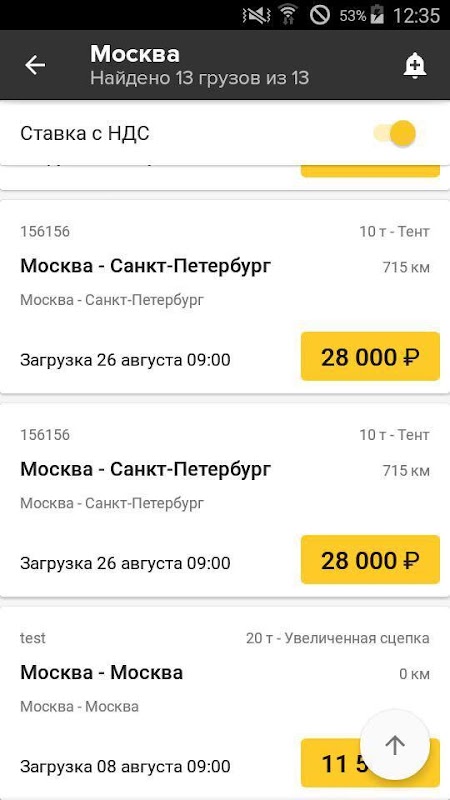 В приложении доступны загрузки для машин 20 тонн с типами кузова реф и изотерм.