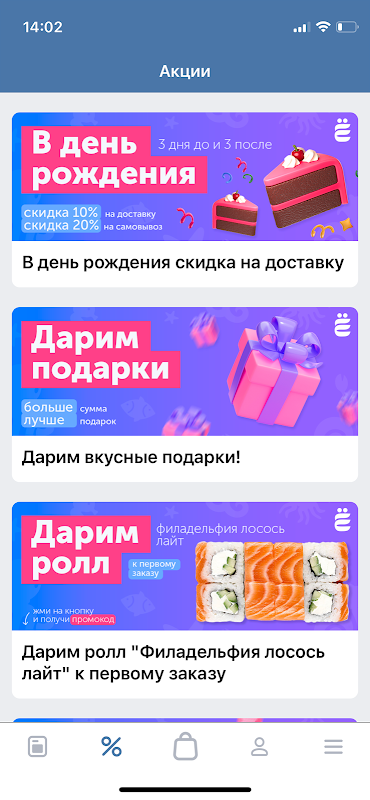 Always at hand, in the application - order history, our promotions. Let's remember your delivery addresses, re-ordering will be even easier and faster!