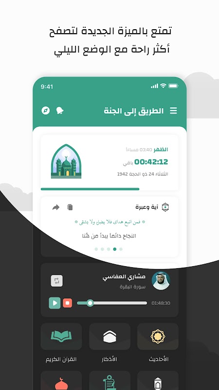 ผู้ใช้สามารถใช้ประโยชน์จากคุณสมบัตินี้โดยเลือกผู้อ่านที่เขาชื่นชอบและเริ่มฟังข้อความของอัลกุรอานจากภายในแอปพลิเคชันโดยไม่จำเป็นต้องใช้แอปพลิเคชันอื่นใด เนื่องจากส่วนนี้จะแสดงรายการของผู้อ่านที่มีชื่อเสียงที่สุด เช่น เช่น: เมชารี อัล-อาฟาซี, อับเดล บาสเซ็ต อับเดล ซามัด, มาห์มูด คาลิล อัล-โฮซารี, มาเฮอร์ อัล-มูอิคลี, อาห์เหม็ด อัล-นาฟิส และนักอ่านอื่นๆ อีกมากมาย พร้อมคำบรรยายของวอร์ชและฮาฟส์