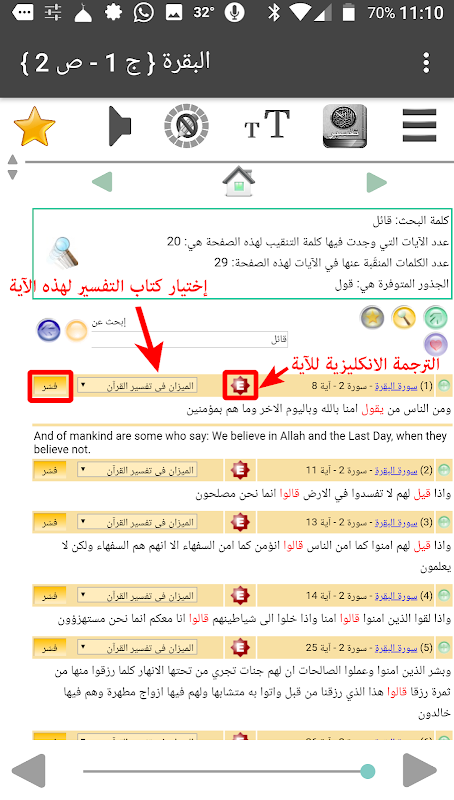 โปรแกรมนี้จะให้พจนานุกรมเลือกสำหรับความหมายของคำที่แปลกในคัมภีร์กุรอานในแต่ละหน้าและหนังสือภาษาอาหรับ Tafsir เช่น 'Tafsir Al-Mueen Lilwaetheen Wal-Muttaetheen' และชีคโมฮัมเหม็ Huwaidi, Almizan Fi Tafsir Alquran, Taqreeb Alquran ILA Alathhan หนืด 'Albayan Fi Tafsir Alquran และ Tafsir Noor Althaqalayn
