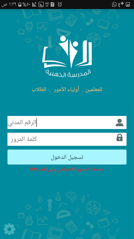 - الدخول إلى التطبيق للمعلم والطالب وولي الأمر والطاقم الإداري للمدرسة.