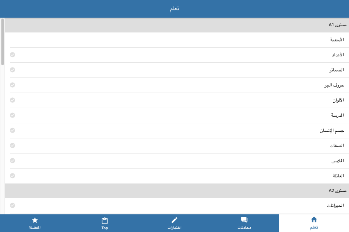 تطبيق اللغة الانجليزية يتكون من أقسام مختلفة.الأقسام من بسيطة إلى معقدة.