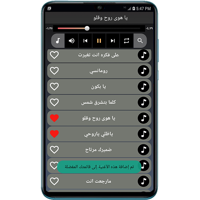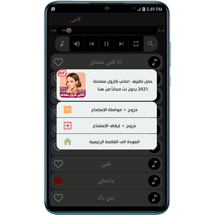 قائمة الأغاني الموجودة في التطبيق: