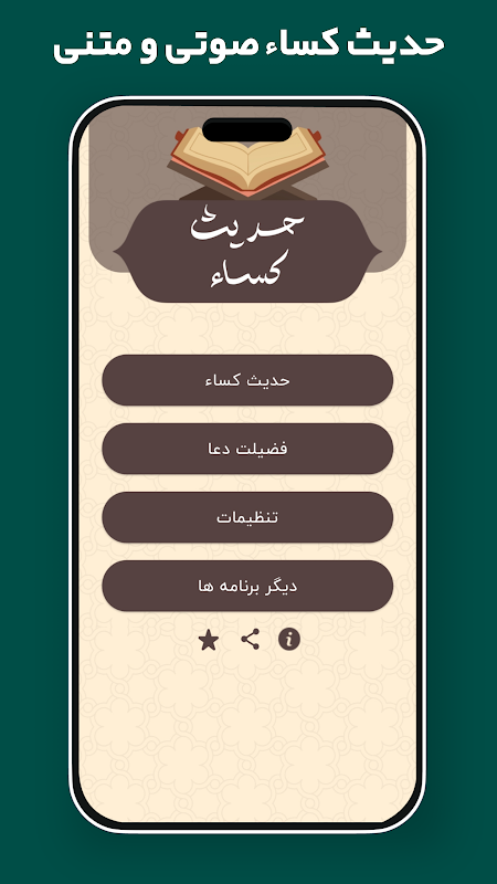 ด้วยแอปพลิเคชั่นเสียงและข้อความ Hadith Kasa คุณจะได้อ่านข้อความเต็มของหะดีษสั้นๆ นี้เสมอ พร้อมด้วยเสียงที่ไพเราะและการแปลภาษาเปอร์เซียและอังกฤษที่แม่นยำ โปรแกรมนี้ได้รับการออกแบบมาสำหรับผู้ชื่นชอบ Ahl al-Bayt ขอความสันติสุขจงมีแด่พวกเขา ผู้ซึ่งสนใจในการสวดมนต์และหะดีษชีอะที่โด่งดัง และมอบประสบการณ์หะดีษอันสูงส่งของ Kasa ที่เรียบง่าย ชัดเจน และไม่มีโฆษณา
