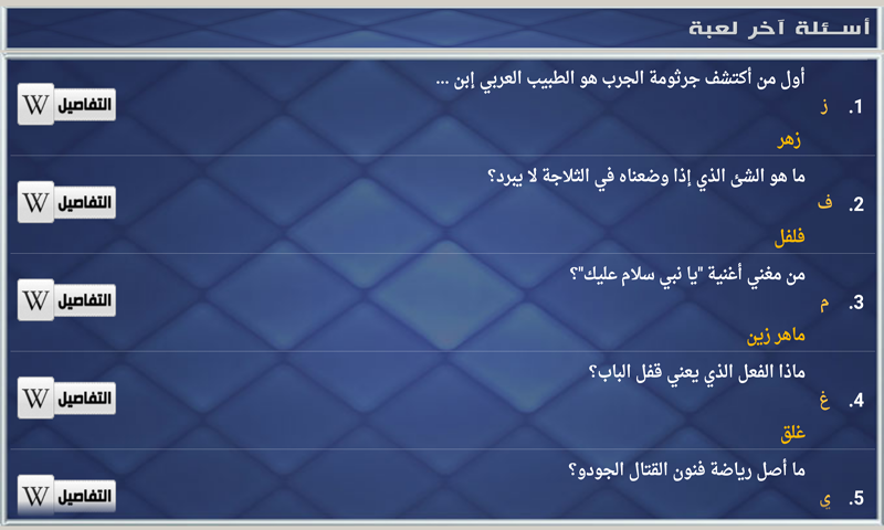 - إمكانية مراجعة جميع أسئلة آخر لعبة و أجوبتها و قراءة معلومات و تفاصيل إضافية متعلقة بالسؤال ( لقراءة المعلومات الإضافية يجب أن تتوفر على إتصال بالنت)
