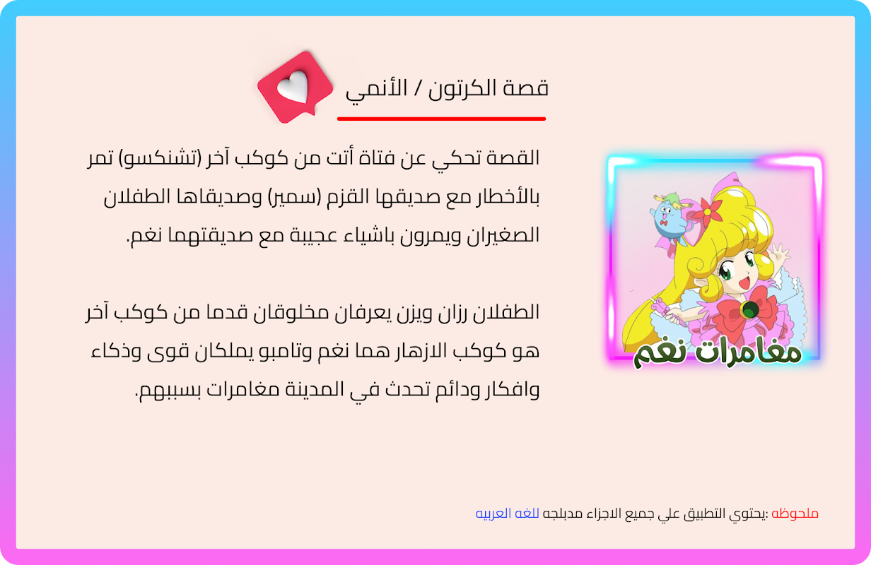 القصة تحكي عن فتاة أتت من كوكب آخرتمر بالأخطار مع صديقها القزم وصديقاها الطفلان الصغيران ويمرون باشياء عجيبة مع صديقتهما نغم.