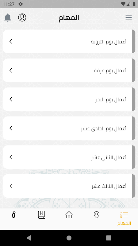 - قائمة بجميع أعمال الحج في جميع الايام وبامكانك التأشير على الاعمال التي تم الانتهاء منها وحفظها للرجوع اليها لاحقا. ( ميزة جديدة لا تتوفر في اي تطبيق حاليا).