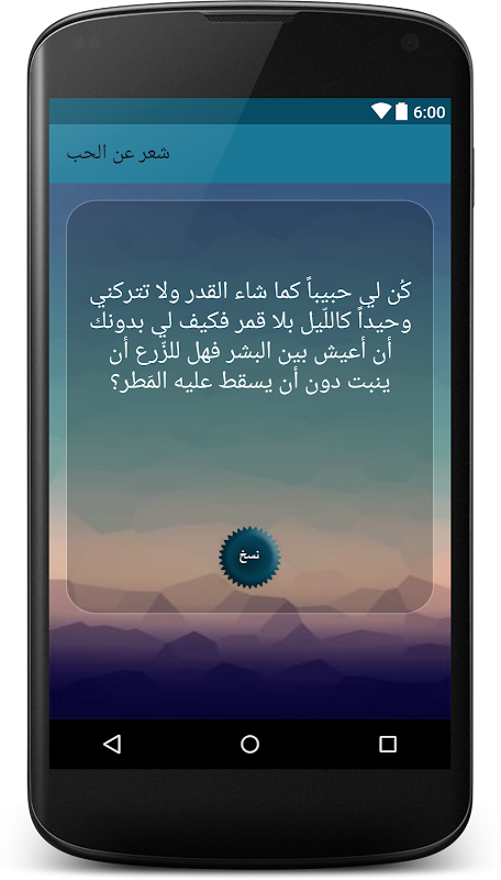 الدي يحتوي على الكتير من الاشعار الرائعة والمدرجة بي الاشخاص بشكل يومي تتصفح الشعر حسب رغبتك وتختار ما تريد لتقوم بنسخ النص (نص الشعرالذي يعجبك) ولصقه على اي تطبيقات مواقع التواصل الاجتماعي ومشاركته مع الاصدقاء والاحباب والاخوة