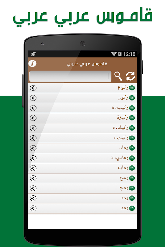 قاموس وترجمة عربي – عربي مجّانيّ، قاموس شامل ومعاصر يتيح تعلّم عربيّة، ويشمل: ترجمة كلمات وجمل،القاموس العربي تطبيق يسمح لك بترجمة الكلمات من اللغة العربية إلى العربية وبالعكس دون الحاجة للاتصال بالإنترنت ومجانًا.
