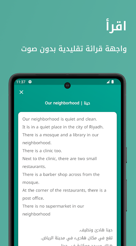 แอปนี้ประกอบด้วยเรื่องสั้นภาษาอังกฤษที่แปลเป็นภาษาอาหรับ คุณยังสามารถฟังเรื่องราวแบบประโยคต่อประโยคและอ่านความหมายเป็นภาษาอาหรับได้อีกด้วย