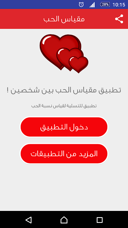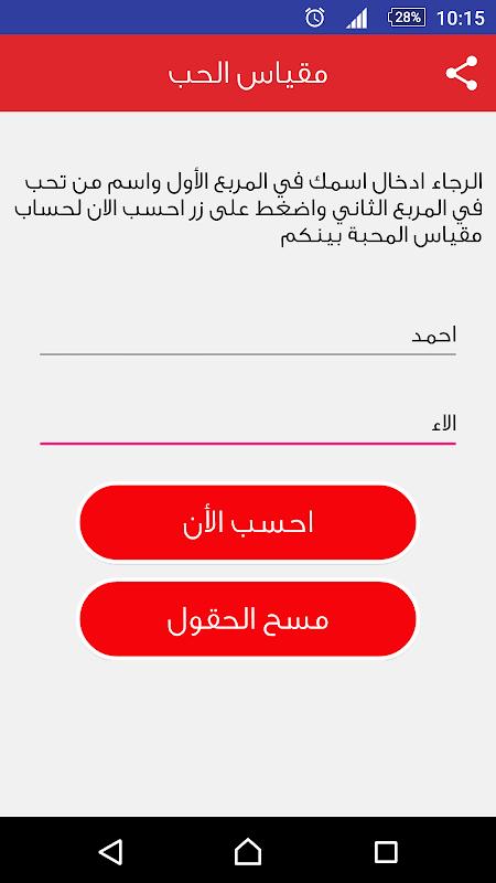 ملاحظة : هذا البرنامج غير حقيقي والنسبة التي سوف تظهر لا تعني النسبة الحقيقية.اجمل حب في تطبيق مقياس الحب و آلة الحب و نسبة التوافق و نسبة الحب حاسبة الحب بينك وبين حبيبك .