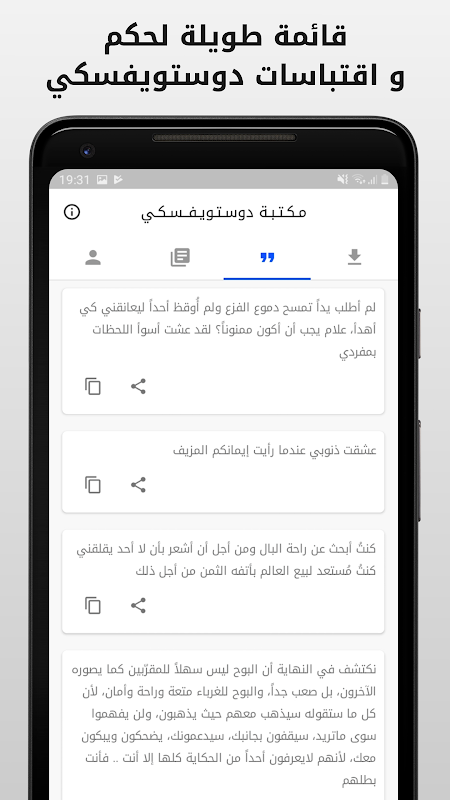 التطبيق يتوفر كذلك على مكتبة ضخمة من حكم و اقتباسات فيودور دوستويفسكي مأخودة من كتب دوستويفسكي.