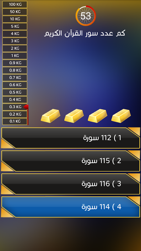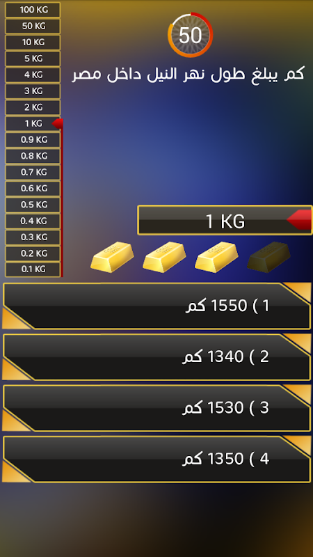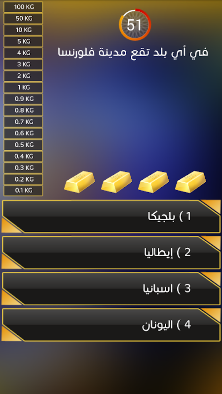 اللعبة تتالف من 17 سؤال كل سؤال يعطيك رصيد من الذهب عليك الاجابة على جميع الاسئلة لكي تصل الى اعلى رصيد وهو المئة كيلو غرام من الذهب