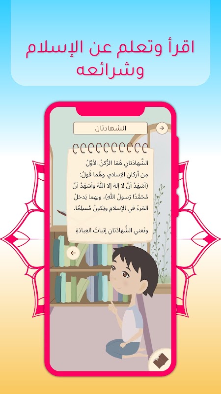 - คำสอนของศาสนาอิสลามเป็นพอร์ทัลหลักแรกในแอปพลิเคชัน และมีจุดมุ่งหมายเพื่อสร้างภาพลักษณ์ที่ถูกต้องของศาสนาอิสลามสำหรับเด็ก โดยในส่วนนี้จะเน้นที่การกระจ่างเกี่ยวกับเสาหลักของศาสนาอิสลาม ความศรัทธาและความเชื่อ และชี้แจงข้อดีของศีลธรรมและการทำธุรกรรม ซึ่งเด็กจะได้เรียนรู้หัวข้อต่างๆ มากมายในคำวินิจฉัยทางกฎหมายและเรื่องศาสนาต่างๆ ที่สัมพันธ์กันเป็นลำดับหัวข้อที่แน่น และส่วนต่างๆ