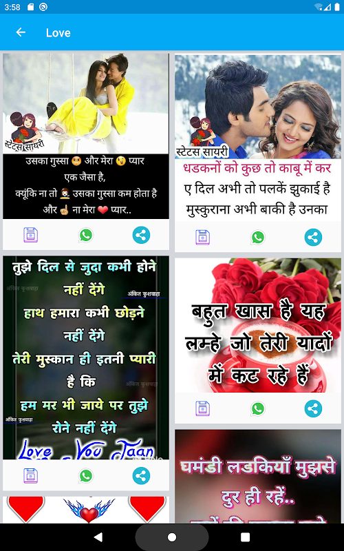 ความรักอัพเดททุกชั่วโมงสถานะโรแมนติก & Shayari จากหมวดหมู่เช่น Love ke fande, Mohabbat Dil Se, Meri jindagi, Bas tum aur mai, Ishk Mohabbat เป็นต้น