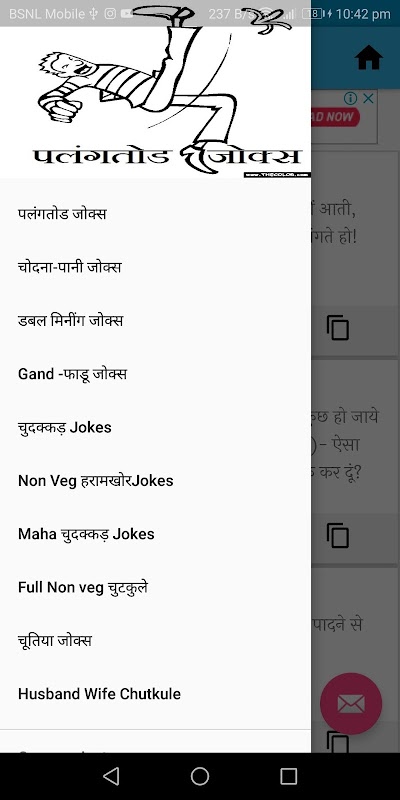 Adult Palangtod Jokes is best app for Hindi Non-Veg Jokes. Here you will find best and latest Adult / non veg jokes. Latest Hindi Jokes from various categories. as husband wife jokes, Santa Banta Jokes, Nurse Doctor Jokes etc.