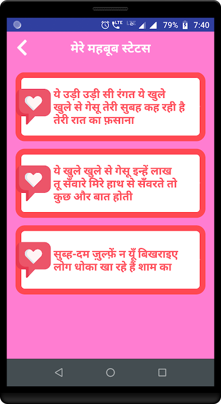 This is one of the best collection of latest Mere Mehboob shayari app which is totally free and no internet connection required . Lover is one of the important part of human life for share there feelings to some we must need a proper text which is attached by our emotion for that this is best and suitable app for you just use and share ultimate feelings .