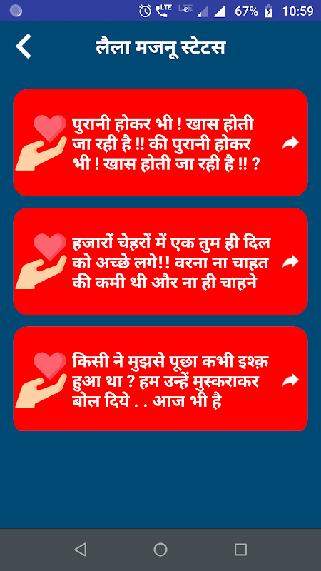 This is one of the best collection of latest Laila Majnu shayari app which is totally free and no internet connection required . Lover is one of the important part of human life for share there feelings to some we must need a proper text which is attached by our emotion for that this is best and suitable app for you just use and share ultimate feelings .