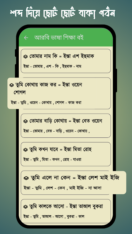 แอปนี้แบ่งออกเป็นทั้งหมด 10 บท โดยแต่ละบทได้รับการออกแบบเพื่อสอนภาษาอาหรับทีละขั้นตอน