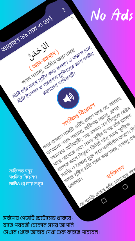 ชื่อของอัลลอฮ์ অ্যাপটিতে আমরা আল্লাহর বিশেষ গুনবต้าচক ৯৯ টি নামে র উল্লেখ করেছি এবং নামগুলোর বাংলaffe অর্থ, সংক্ষিপ্ ত বিশ্লেষণ ও ফজিলত তুলে ধরেছি। যাতে করে সবตราই আল্লাহর নামগুলো শুদ্ধভ Bhaবে উচ্চারণ ক রতে পররে সেজন্য অডিও শোনার ব্যবস্থাও রেখেছি।