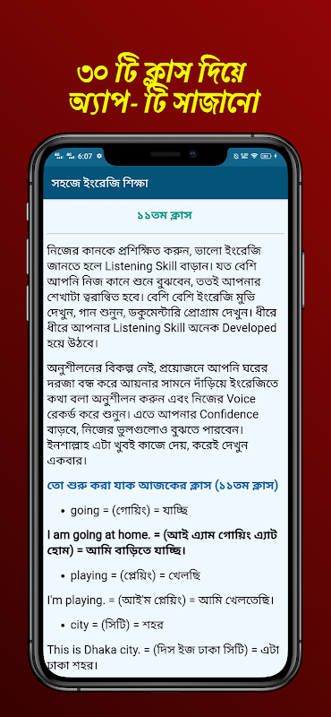 াদের দৈনন্দিন জীবনে চলতে গেলে ইংরেজির প্রয়োজন অহরহ। আমরা অনেক এ ইংলিশ পারি কিন্তু ইংলিশ এর প্রয়োগ কোথায় কিভাবে তাই জানি না। আবার অনেক এ ইংরেজি অনেক শব্দ জানেন কিন্তু তা দিয়ে গুছিয়ে কথা বলতে পারেন না। এমন যারা আছেন তাঁদের আর চিন্তা নেই আমরা নিয়ে এসেছি আপনার জন্য খুব সুন্দর সাবলীল ভাষায় মাত্র ৩০ ক্লাস এ ইংরেজি শেখার অ্যাপ।
