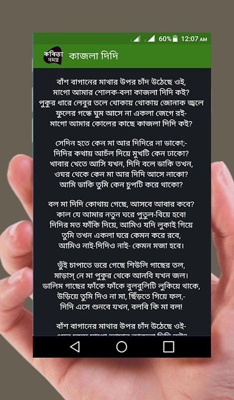 Number of people who love poems are numerous. Poetry and poetry have been practiced since ancient times, in the subcontinent. Come to you with many of the best poems from the poem's poems book. Hope you enjoy the app. Make your leisure time happy. Your childhood is forced to remember these poems. Much like to recite and listen to. For them, this app is a gift from us. Such as starting with Rabindranath.