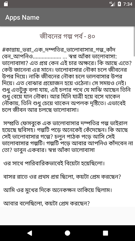 আমাদের ভালবাসার সকল কষ্টের জীবন কাহিনী নিয়ে সাজানো হয়েছে এই বাস্তব কষ্টের জীবনের গল্প এপ্সটি । ভালবেসে হয়ত বা অনেকেরই জীবন কষ্টে ভরপুর হয়ে নিঃশ্বেস হওয়ার উপক্রম । প্রেম কাহিনী, জীবন কাহিনী এগুলো প্রায় সবার জীবনেরই নিত্যদিনের ঘটনা । প্রেম কাহিনী, জীবন কাহিনী তে কেউ সুখী আবার কেউ দুঃখী । কারও জীবন কষ্টের আবার কারও জীবন সুখের । ভালবাসার গল্প, কষ্টের ভালবাসার গল্প, কষ্টের জীবেনের নানা কাহিনী নিয়ে তৈরি করা হয়েছে আমাদের এই কষ্টের জীবনের গল্প এপ্সটি । আমরা তো অনেকেই জীবনে কত ভালবাসার গল্প, ভূতের গল্প,কষ্টের ভালবাসার গল্প, কষ্টের জীবন কাহিনী, কষ্টের জীবনের বাস্তব গল্প নিয়ে তৈরি করা নানান রকম এপ্স পড়ে থাকি । আর তাই আমাদের জীবনের নানা কষ্টের কথা গুলো নিয়ে তৈরি করা এই কষ্টের জীবনের গল্প এপ্সটি পড়বেন । আর আমাদের এপ্সটি পড়ি আপনার অবশ্যই অবশ্যই ভাল লাগবে । ইনশাআল্লাহ ।