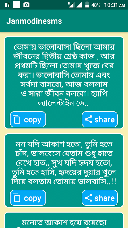 সবাইকেজানাইআন্তরিকঅভিন্দনওজন্মদিনেরএসএমএসবন্দুদেরপাঠানোরজন্যসুন্দরএকটিএকটি। এখানেআপনিপাবেনবাংলায়লিখিতচমৎকারসবমেসেজ। বন্দুএসএমএসটিআপনাদেরসকলবন্দু / বান্দবদেরমাঝেকপিবাশেয়ারকরেকরেপাঠাতে।। এখানেমঝারমঝারবাংলএসএমএসপড়তেপাড়বেনএবংআপনারপ্রিয়মানুষটিকেপাঠাতেপাঠাতে। এখনথেকেমনখুলেপ্রিয়মানুষেরকাছেম্যাসেজে, মেসেন্জারে, ফেসবুকে, ইমোতেএছাড়াওআরোঅনেক। কথায়আছেমনেরমধ্যেগুরপাকখায়যামুখেআসেনাসেইসবকথাকথানিয়েইএবসটি।। แอปพลิเคชั่นএইবাংলাএসএমএস (জন্মদিনএসএমএস) টিআপনাদেরকেমনলাগলোঅবশ্যইজানাবেন। ধন্যবাদ!