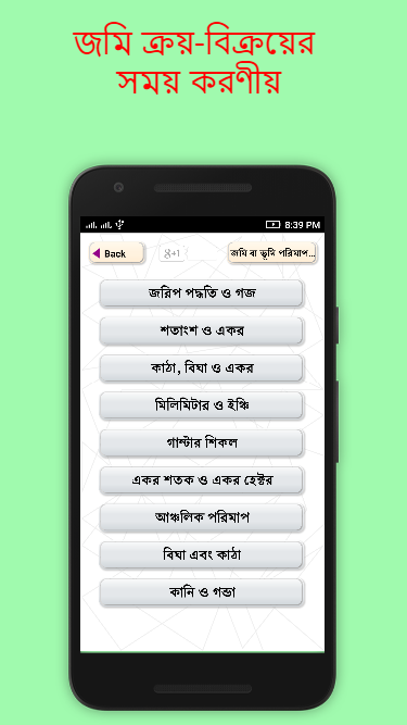 วันนี้ผมได้นำระบบการวัดที่ดินหรือที่ดินของบังคลาเทศมาให้คุณ ซึ่งคุณสามารถหาได้จากแอพนี้ ฉันได้พยายามที่จะบันทึกที่นี่เกือบทุกสิ่งที่คุณต้องรู้เพื่อวัดที่ดิน เราต้องเผชิญกับความสูญเสียทางเศรษฐกิจเป็นจำนวนมากในขณะที่ซื้อและขายที่ดินเนื่องจากไม่เข้าใจการคำนวณและขนาดของที่ดิน เราไม่รู้เรื่องการวัดที่ดินหรือการสำรวจที่ดิน เราไม่เข้าใจเมื่อมีการวัดหรือสำรวจที่ดินในบ้านหรือบ้านในหมู่บ้านของเรา และฉันไม่เข้าใจ ไม่มีทางอื่นนอกจากต้องมอง ดังนั้นวันนี้ผมจะมาพูดถึงวิธีการต่างๆ ในการวัดที่ดินเพื่อให้คุณได้แนวคิดที่ชัดเจน ซึ่งคุณสามารถทราบขนาดที่ดินตามกฎหมายที่ดินของบังคลาเทศได้อย่างง่ายดาย และเรียนรู้งานทางคณิตศาสตร์ประเภทต่างๆ ผ่านแอป