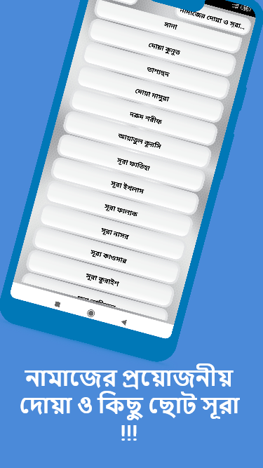 নামাজেরসকলদোয়াওসূরাঅডিওসহবাংলাউচ্চারনওঅনুবাদনিয়েএইআয়োজন। আমাদেরএইঅ্যাপেপাবেননামাজেরসকলদোয়াযেমন-সানাসহতাশাহুদদুরুদশরীফদোয়ামাসুরাদোয়াকুনুতঅডিওবাংলাঅর্থওউচ্চারন