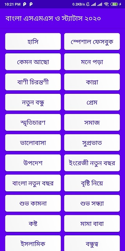 বাংলা এসএমএস ও ফেসবুক স্ট্যাটাস অ্যাপে রয়েছে সেরা সব এসএমএস ও ফেসবুক স্ট্যাটাস এর কালেকশন।