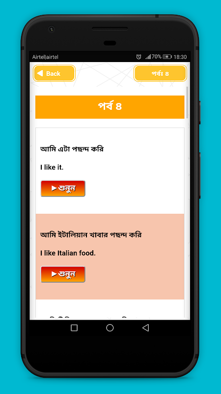 แอปแปลประโยคภาษาเบงกาลีเป็นภาษาอังกฤษควรได้รับการฝึกฝนทุกวันเพื่อให้ทราบการออกเสียงภาษาอังกฤษที่ถูกต้อง ซึ่งจะทำให้การพูดภาษาอังกฤษง่ายขึ้นมาก หากคุณต้องการพัฒนาทักษะการพูดภาษาอังกฤษของคุณ ไม่มีสิ่งใดมาทดแทนการฝึกแปลภาษาอังกฤษได้ ไม่เพียงแค่นั้น หากคุณไม่ทราบความหมายของคำภาษาอังกฤษที่มีการออกเสียงในภาษาเบงกาลี ก็มีโอกาสผิดพลาดสูง ดังนั้นแอพนี้จึงเพิ่มการแปลและการออกเสียงภาษาอังกฤษที่ถูกต้อง