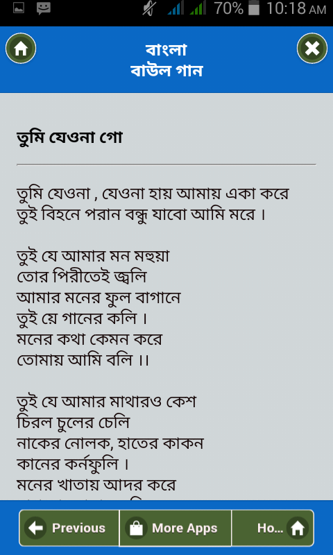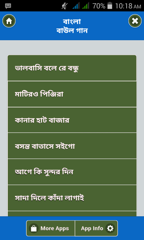 বাউল গান বাংলার মানুষের প্রাণের গান যে গান শুনে মানুষ ফিরে যায় তাঁর অতিতে আর ফিরে ফিরে তাকায় ফেলে আশা নারীর টানকে। বাংলা বাউল গান অ্যাপ এ আমরা হৃদয় কাঁপানো কিছু গান একসাথে করেছি যা শুনে আপনার শরীরের লোম দারিয়ে যাবে এবং আপনি ফিরে পাবেন হৃদয়ের সন্ধান। এখানে আপনি বিখ্যাত সকল বাউল শিল্পীদের মন মাতানো বাউল গান একসাথে পাবেন।