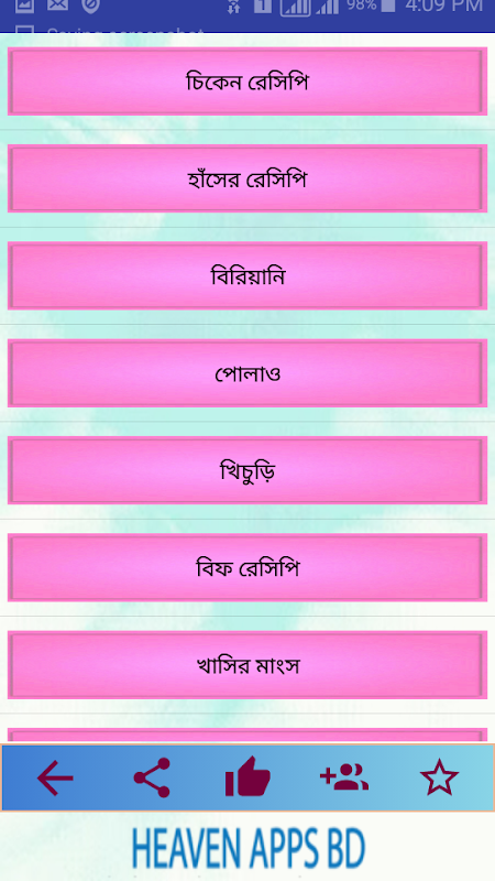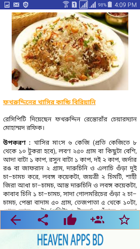 indian bengali recipes in bangla are coming after our bangla recips. Bengali recipes for the Bengali people, and indian bangla recipe book in bengali for the Indians. we hope all chaff are like this recipes app, because this bangla recipe book in bengali offline app, so any one can easily the recipe book free download and send to anybody this food recipes app in bengali.If our recipe book free app takes advantage of you, then our work is worthwhile. and If our recipe book in bengali is good for you, please give us more encouragement by 5 * star rating.