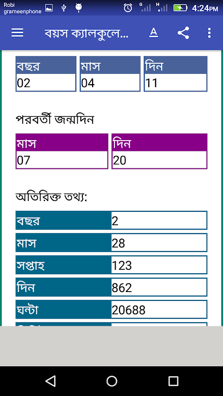 এ ছাড়া আপনার জন্ম দিন আসতে আর কত দিন কত মাস বাকি তার ও হিসাব পাবেন, সাথে আগামি ১০ বছরেরর জন্ম দিনের তারিখ এবং কি বার তাও জানতে পারবেন।