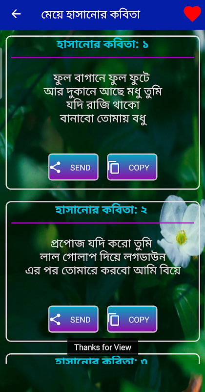 এই অ্যাপসটিতে যে সব মনের মতো নতুন স্ট্যাটাস এন্ড পোষ্ট আছে তা অপনি বন্দুদের সাথে কপি এবং শেয়ার করতে পারবেন ।প্রতিটি মনের মতো নতুন স্ট্যাটাস এন্ড পোষ্ট বাছাইকৃত ভাবে নেওয়া হয়েছে । আশা করি অ্যাপসটি আপনাদের অনেক ভালো লাগবে।