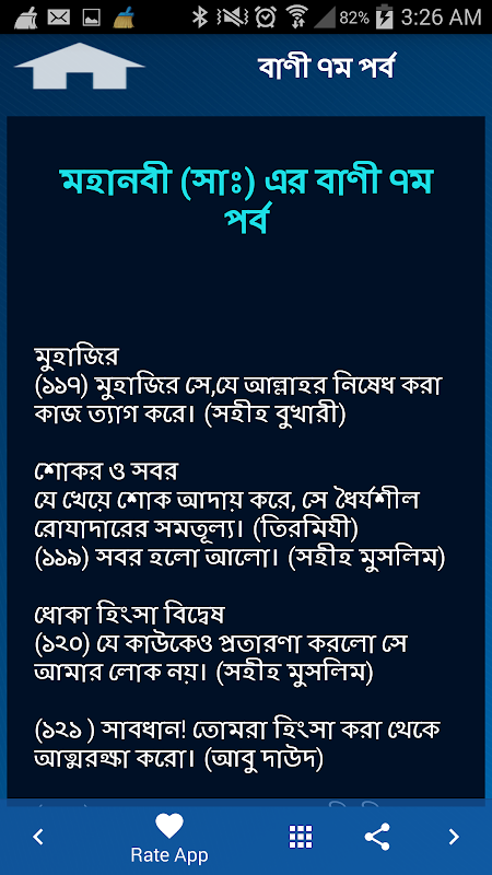 Mohanobir Adorsho Bani~মহানবীর বাণী ইসলামিক উক্তি is an bangla apps include collection of islamic quotes of hazrat muhammad SallallahuAlaihiwasallam in Bangla quotes/ Bangla ukti, as bani in bengali. In this app you will found lots of inspirational and dirrectional bangla quotes of rasulullah as bangla islamic quots. From the various quotes, mohanobir jiboni,nobijir adorsho bani, monishider bani, inspiring quotes, monishider jiboni and rasuler bani we collected the best quotes as best resource for you. nobir bani is the directional guideline for all of us.