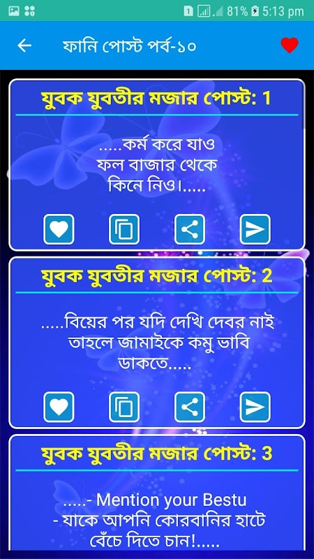 যুবক যুবতীর মজার ফেবু পোস্ট Apps আপনাদেরকে দিবে চরম বিনোদন।মন খারাপ হলে মন ভালো করার মহা ঔষধ হচ্ছে মজার ফানি পোস্ট আর আপনার মনের খোরাক দিতে আমাদের এই অ্যাপসটি।যে কোন boring টাইম pass করার জন্য এই অ্যাপস হবে আপনার ভালো লাগার খোরাক।