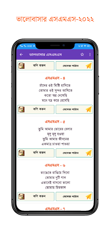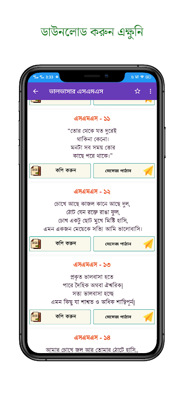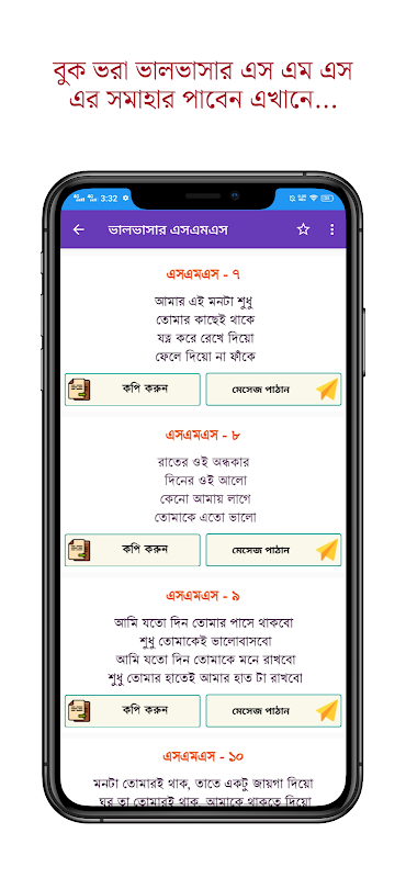 এই অ্যাপ- এ এসএমএস স্টও রয়েছে ভ Bhaলভa সার, স্ট্যাটাস, রোমান্টিক স্ট্যাটাস, মনে পরার স্ট্যাটাস, দুঃখের স্ ট্যাটাস, ভaলোবต้าসর কথা ইত্যাদি।