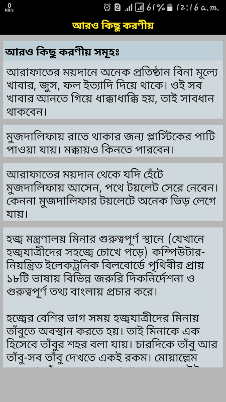 แอพนี้เกี่ยวกับคู่มือฮัจญ์และอุมเราะห์ฮัจญ์และอุมเราะห์ได้รับการกล่าวถึงในรายละเอียดในแอพ มีการอภิปรายโดยละเอียดเกี่ยวกับสิ่งที่ต้องทำที่สนามบินบังกลาเทศและเมกกะ - เมดินาโดยเริ่มจากการเตรียมการสำหรับทุกคน