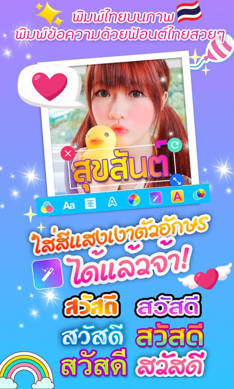 - เพิ่มแบบอักษร ฟ้อนท์ไทยน่ารักๆ , เพิ่มการตกแต่งข้อความบนภาพ, เพิ่มกรอบรูปและสติกเกอร์น่ารักๆ