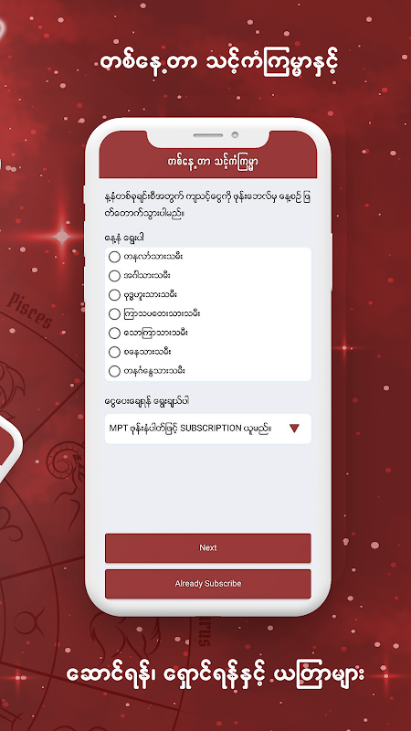 The future prediction algorithms used in Min Thein Kha BayDin Application are based on the principle of Sayargyi Min Thein Kha. Min Thein Kha BayDin Application has featured Yearly prediction papers, Weekly prediction papers. Each prediction papers includes the topics of economy, health, social, marriage, education predictions, things to do and don’t, and advice to avoid unfortunate events. You can use Min Thein Kha BayDin app to find predictions for your family, your friends and colleagues and share on Facebook. The information and data contained on this app are provided by Daw Than Nu Aung, who own Intellectual Property and is authorized person to allow us to use Sayargyi “Min Thein Kha” name, image, prediction papers and theories used in our app.