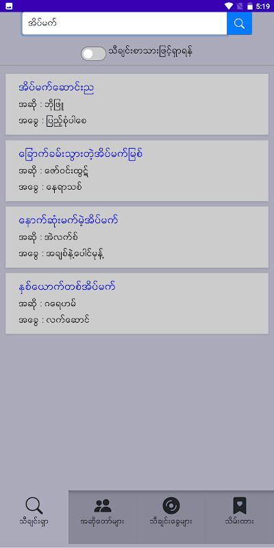 นี่คือคอลเลกชันที่สมบูรณ์ที่สุดของเนื้อเพลงพม่าและคอร์ดกีตาร์ เพลงเป็นชื่อเพลง, ชื่อนักร้อง คุณสามารถค้นหาตามชื่ออัลบั้มและเนื้อเพลงได้อย่างง่ายดาย