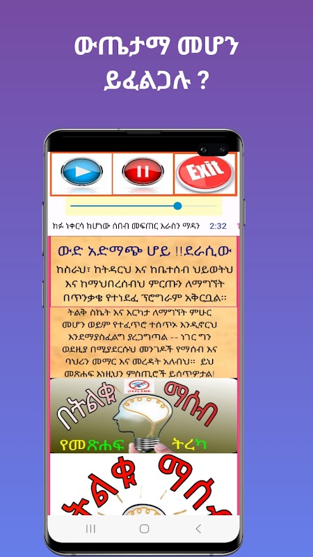 แอปพลิเคชั่นนี้มี The Magic of Thinking Big หนังสือที่ยอดเยี่ยมในภาษาอัมฮาริกในรูปแบบเรื่องเล่าที่ผู้คนนับล้านทั่วโลกเป็นพยานว่าได้ปรับปรุงชีวิตของพวกเขา