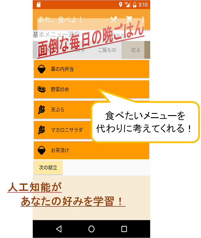 毎日の面倒な食事。あれ食べようか、これ食べようか。。。 考えるのも面倒なときに、このアプリが面倒な考え事を引き受けてくれます! 「そうだ、あれ食べよ!」:^^)