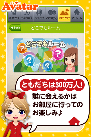 ◎いろんな人の部屋に遊びにいけたりできる。アバターに着せる洋服の参考になるね。ガチャもいろんな種類があって飽きが来ない。新しいガチャがでる頻度も多くていいと思う。更新も多く新しい機能が日々増えてGood!!