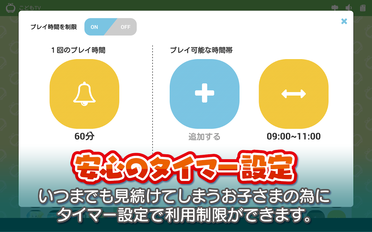 このアプリでは、スマホ・タブレット上で(1)“子どもに見せても良い動画”の選択(2)“利用時間タイマー”の設定が可能になります。
