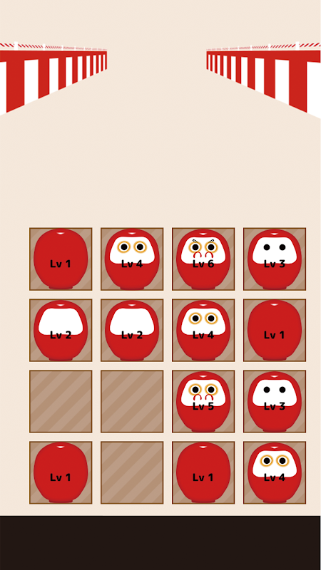【遊び方】 だるまをフリックすると動くよ。同じレベルのだるまと衝突するとレベルが上がって、次のだるまが完成!どんどんレベルを上げて、だるまを完成させよう!