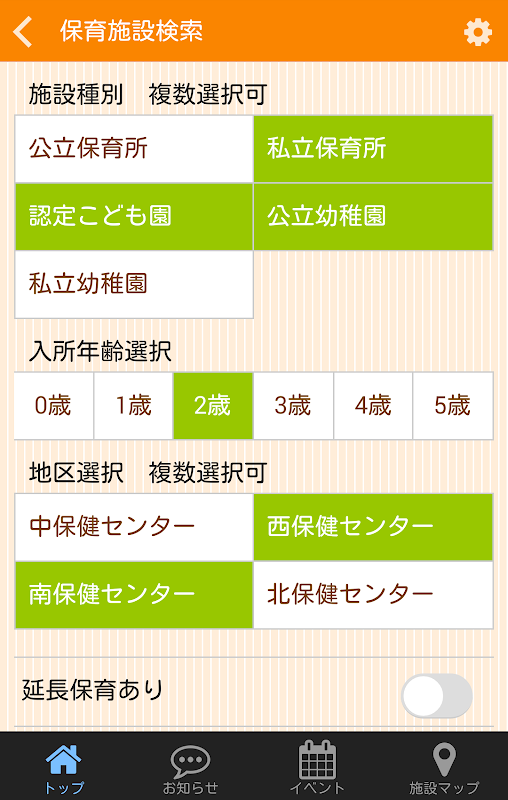 GPS機能を利用し、近隣の子どもと遊びにいけるスポットや、保育所(園)や幼稚園、その他の子育て関連施設を検索できます。