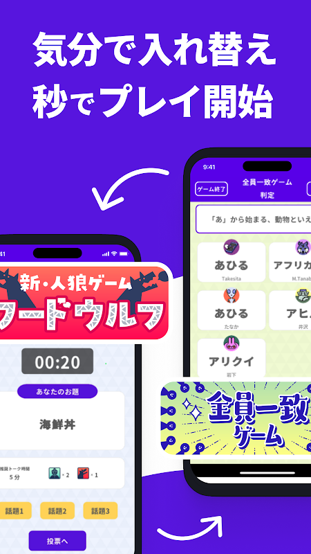 "Word Wolf" เกมหมาป่าใหม่ที่ใช้คำศัพท์; "20 Doors" เกมฝึกคิดนอกกรอบภายในแอป; "Unanimity Game" เกมที่ให้คุณชนะด้วยการจับคู่คำตอบของทุกคน; เวอร์ชันแอปออนไลน์ของเกมกระดานคลาสสิก "Quiz Ii Sen Ikima SHOW!"; "100 Questions" เกมตอบคำถามที่ให้คุณลองเดาคำตอบของบุคคลหนึ่ง; "Anonymous Survey" หรือที่รู้จักกันในชื่อ "Who Pressed?"; "Kaidan Shironogatari" เกมที่ทำให้เรื่องราวสยองขวัญดูน่ากลัวน้อยลง; "Majority Party" เกมปาร์ตี้สุดยอด; "Omniscience Omnipotence" เกมที่ให้คุณซ่อนตัวตนที่แท้จริงของคุณ; "NG Word Game" เกมพูดคุยแบบดั้งเดิม; "Umbrella Online" เวอร์ชันออนไลน์ของ "Turtle Soup" (เกมการคิดนอกกรอบ); "Udon TRPG" ที่คุณทำและเสิร์ฟเส้นอุด้ง; "Anonymous" เกมปาร์ตี้ไฮกุ (เซ็นริว); "Word Detective" เกมเชื่อมโยงคำศัพท์แบบทีม; "Kokin Nanboku" เกมปาร์ตี้คลาสสิกที่เพิ่มกฎกับดักให้กับเกม Yamanote Line; และ "Hit and You ยังสามารถเล่น "Master Number" เกมใหม่ในประเภทการเดาตัวเลขแบบตรรกะคล้ายกับเกมอย่าง Blow และ Numeron; "Psychological Rock-Paper-Scissors" เกมเป่ายิ้งฉุบแบบจิตวิทยา; "Are Talk!" เกม RPG บนโต๊ะที่ได้รับแรงบันดาลใจจากรายการวาไรตี้สนทนาแบบกลุ่ม; "Don't Duplicate Your Rankings (Self-Assessment Game)" ซึ่งคุณสามารถเล่นได้โดยการป้อนอันดับของคุณ; เกมไพ่คลาสสิกชื่อดังอย่าง "Daifugo"; "Reversi" ที่มีฟีเจอร์ใหม่สำหรับผู้เล่นสามหรือสี่คน; "Shogi" ที่มีตัวหมากใหม่ที่เรียกว่า Suichou และ Taishi; "True or False" Game ที่มีมินิเกมเช่น Super True or False, Disappearing True or False และเกม True or False สำหรับผู้เล่นสามคน; "American Page One" เกมต่อยอดจากเกมอย่าง UNO, Last Card และ Crazy Eights; "Drawing Quiz" เกมตอบคำถามวาดภาพออนไลน์; และ "Choice Game" แบบทดสอบเอาชีวิตรอดแบบเลือกตอบ